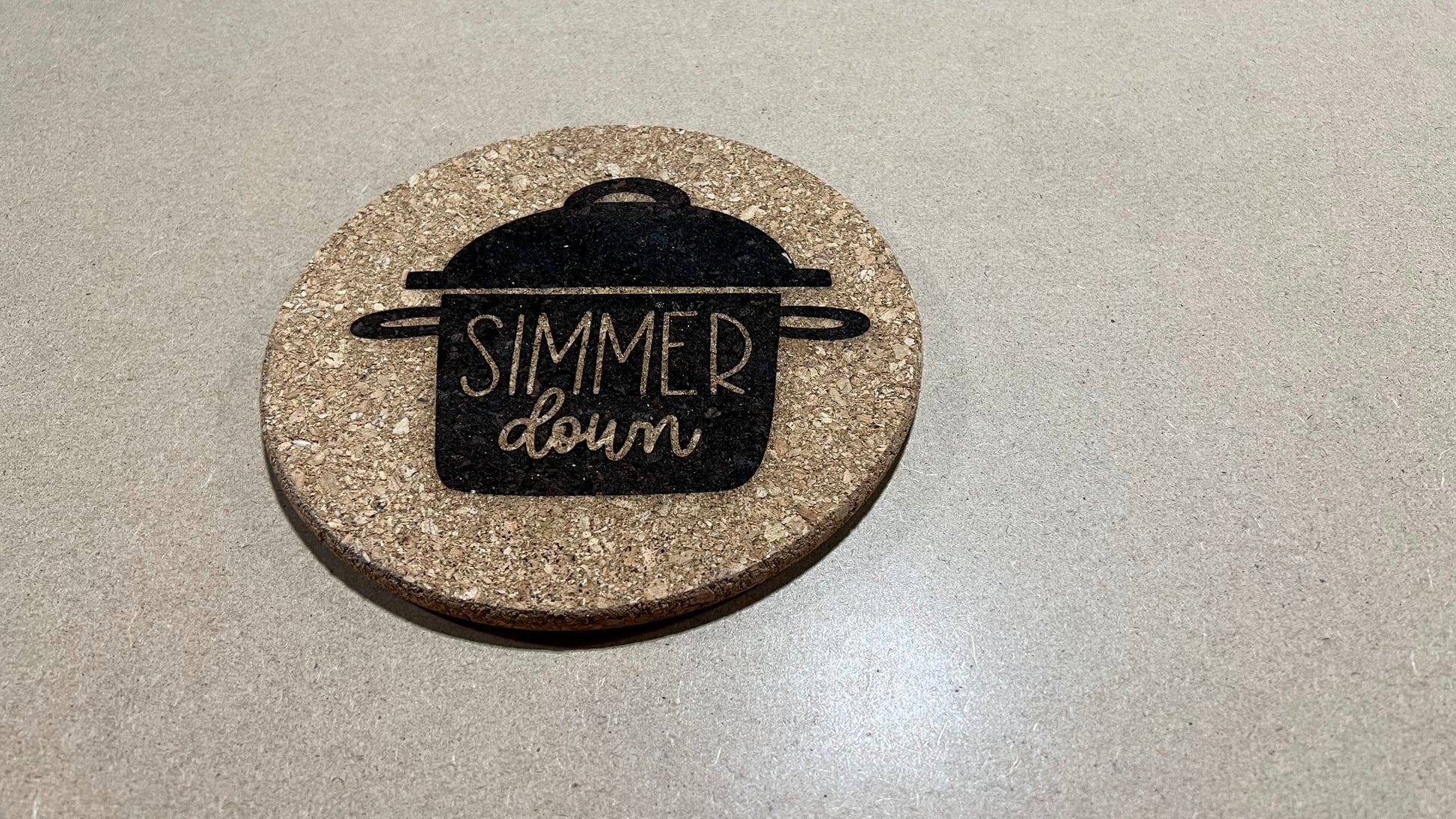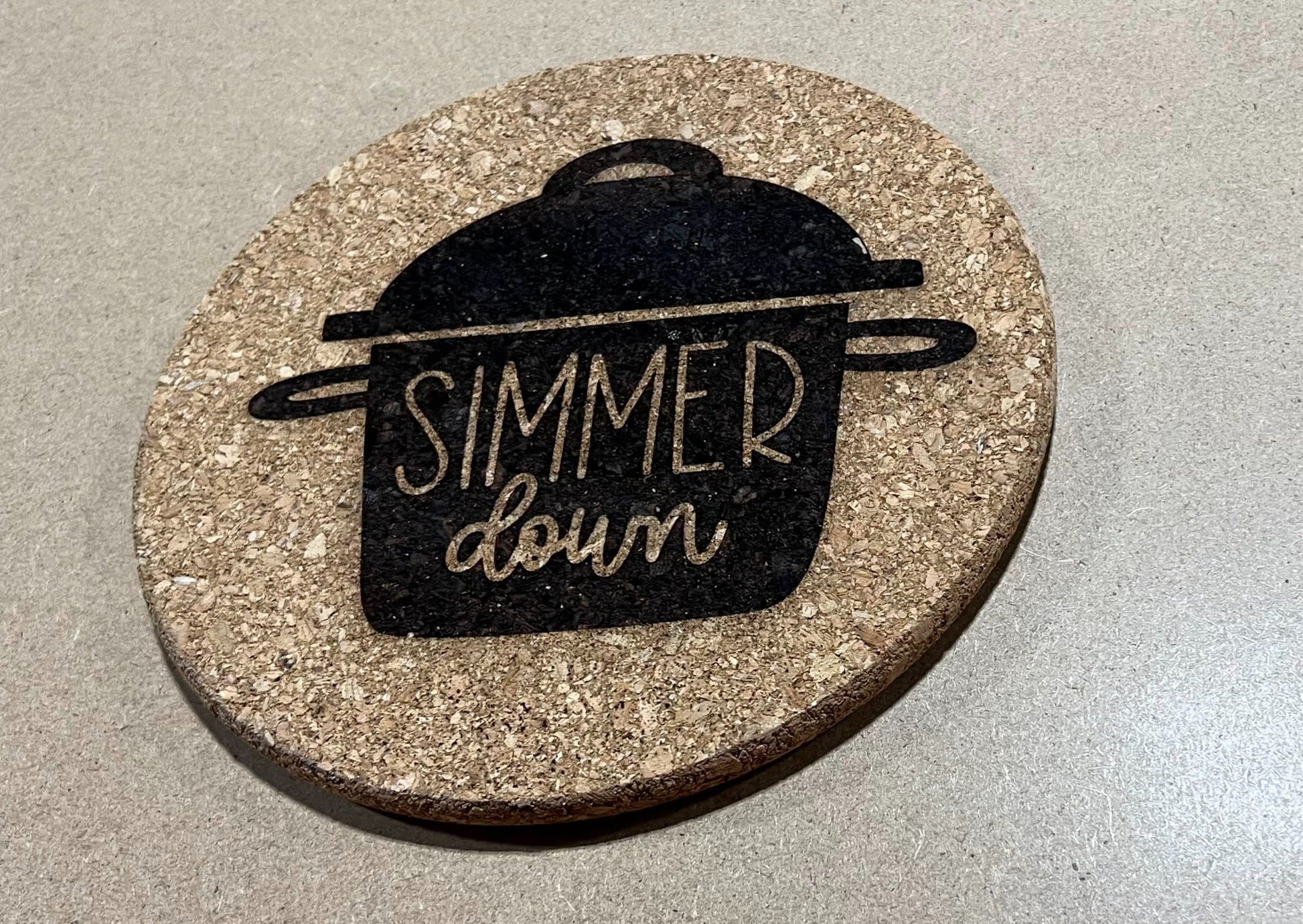 This is a 7" cork wood trivet with Simmer Down engraved into it.